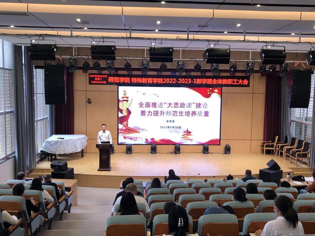 8月30日下午,学校副校长余荣宝来到师范学院,以《全面推进“大思政课”建设 着力提升师范生培养质量》为题,为师范学院全体教职工上了一堂生动的党课。